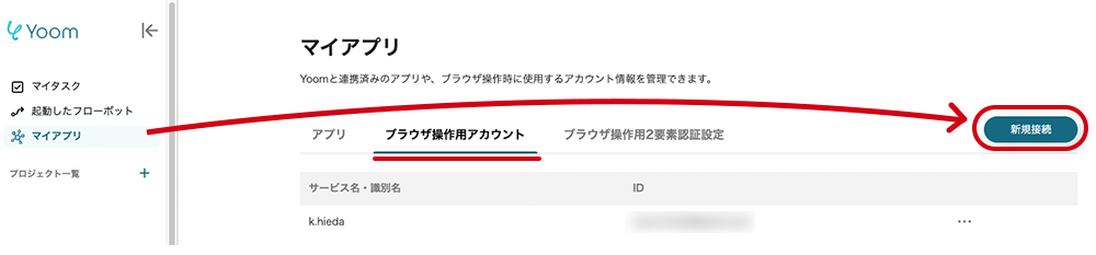 マイアプリ画面の【ブラウザ操作用アカウント】タブを選択し、+新規接続をクリックします。