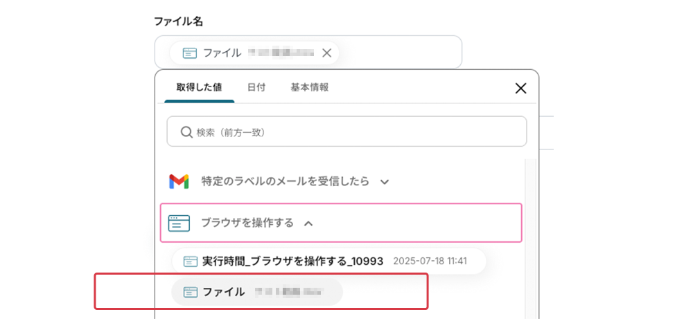 ⑧ファイルの添付方法で、「取得した値を使用」を選択し、候補から⑤で取得したファイルを設定します。