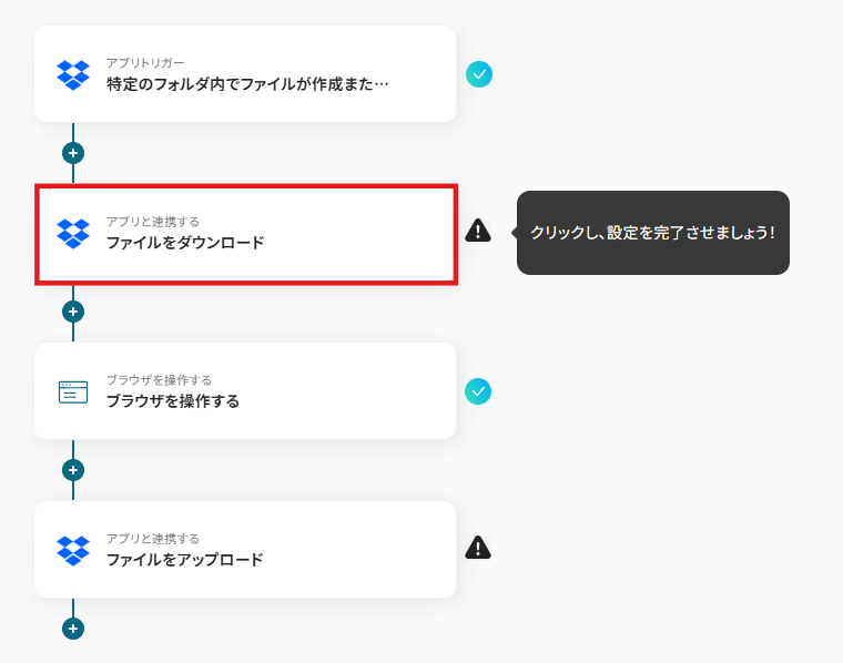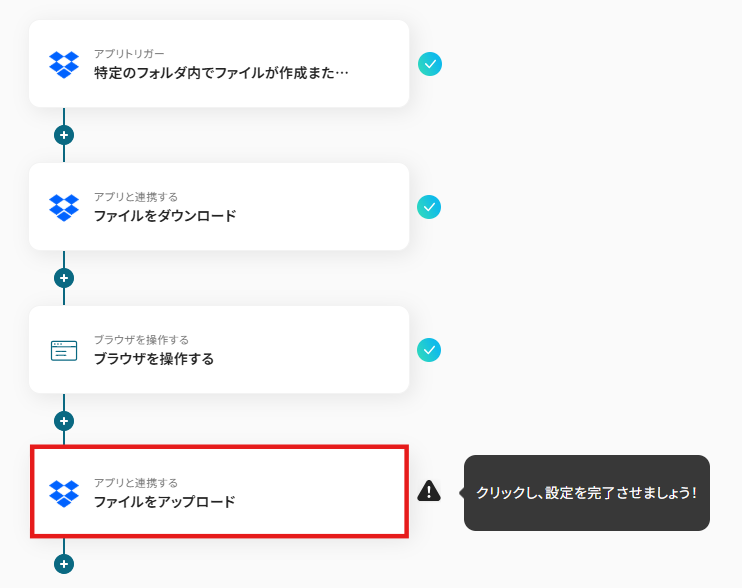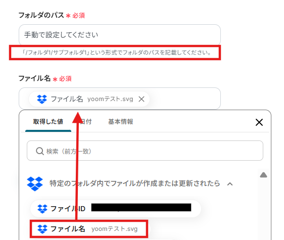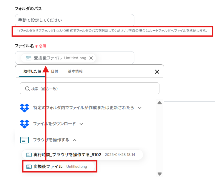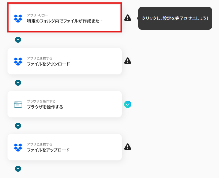 - Dropboxのトリガー設定およびファイル変換アクション設定