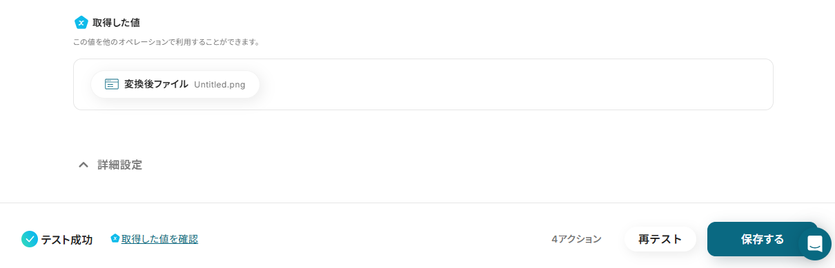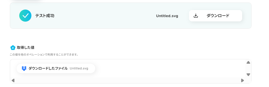 6.設定後、「テスト」をクリックしてください。テストが成功した場合は、アウトプットが取得できます。