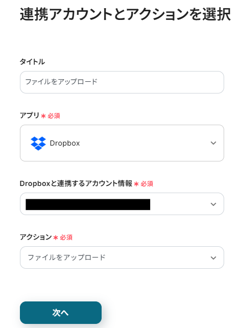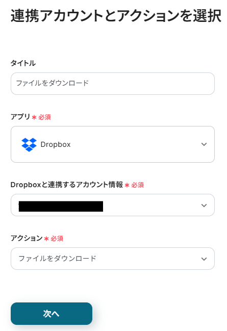 先ほどと同様にタイトルと連携するアカウント情報を任意で設定し、アクションはテンプレート通りに「ファイルをダウンロード」のまま下にスクロールします。