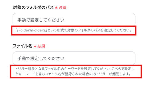4.対象のフォルダのパスとファイル名は、以下の赤枠を参考に設定していきます。