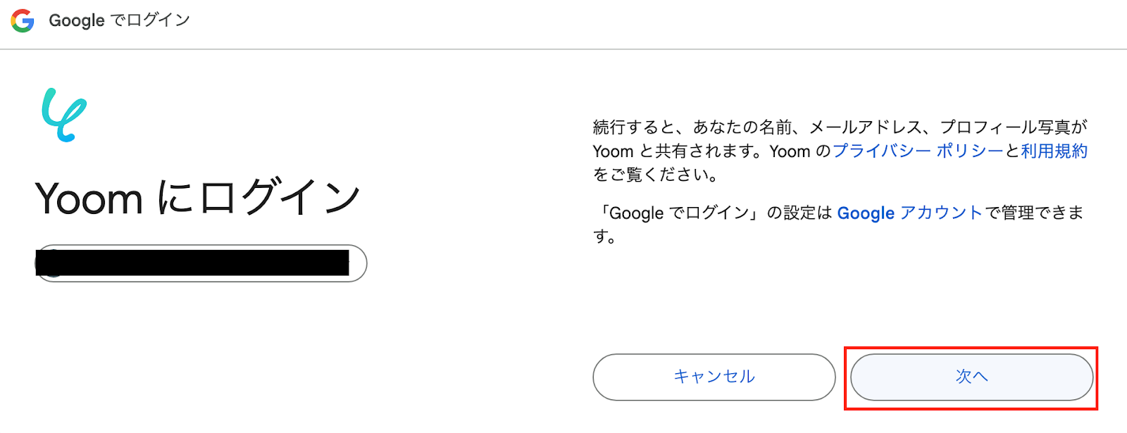 画面が遷移したら、「次へ」をクリックし、以下の画面でYoomがアクセスできる情報の選択を求められるので「すべて選択」をクリックします。