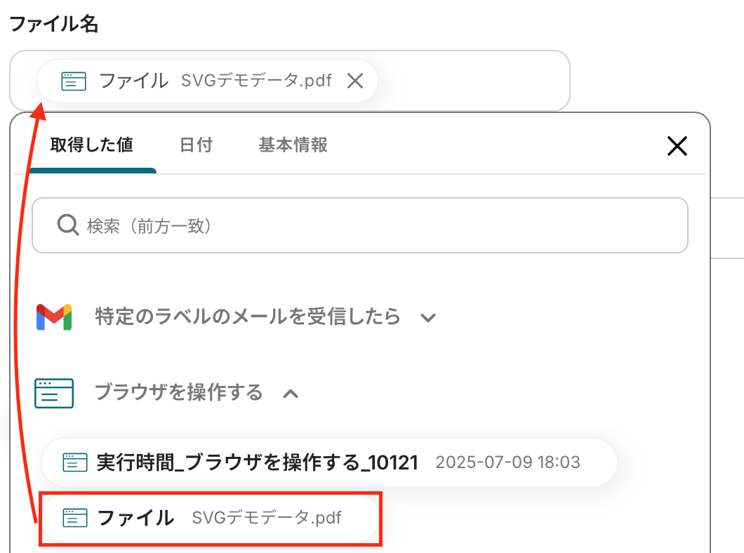 ⑧ファイルの添付方法で、「取得した値を使用」を選択し、候補から⑤で取得したファイルを設定します。