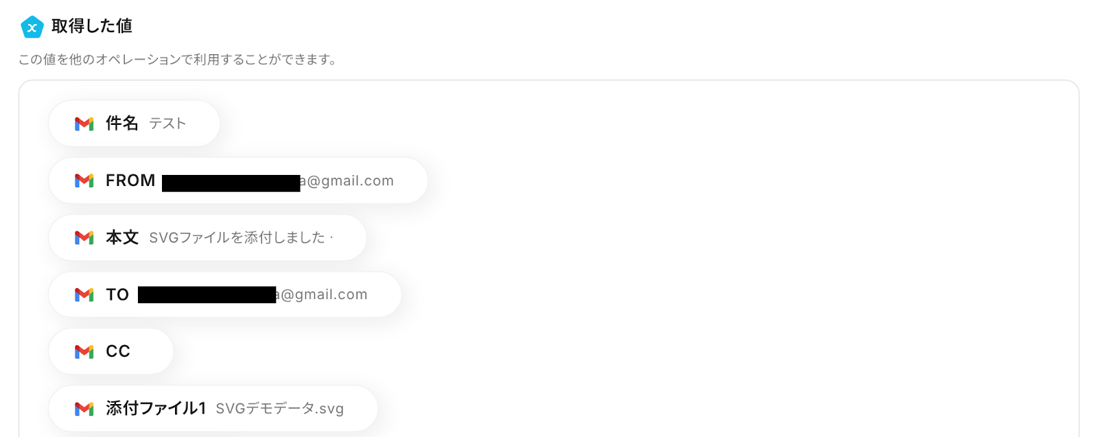 テストが成功すると、アウトプットを取得できます。ここで取得したアウトプットを、後のアクションで利用します。
