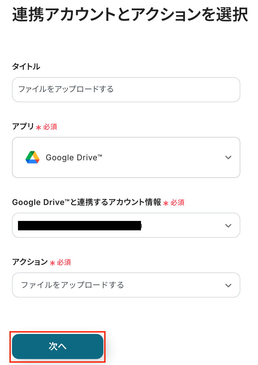 タイトルと連携するアカウント情報を設定し、アクションはテンプレート通りのまま「次へ」をクリックして進んでください。