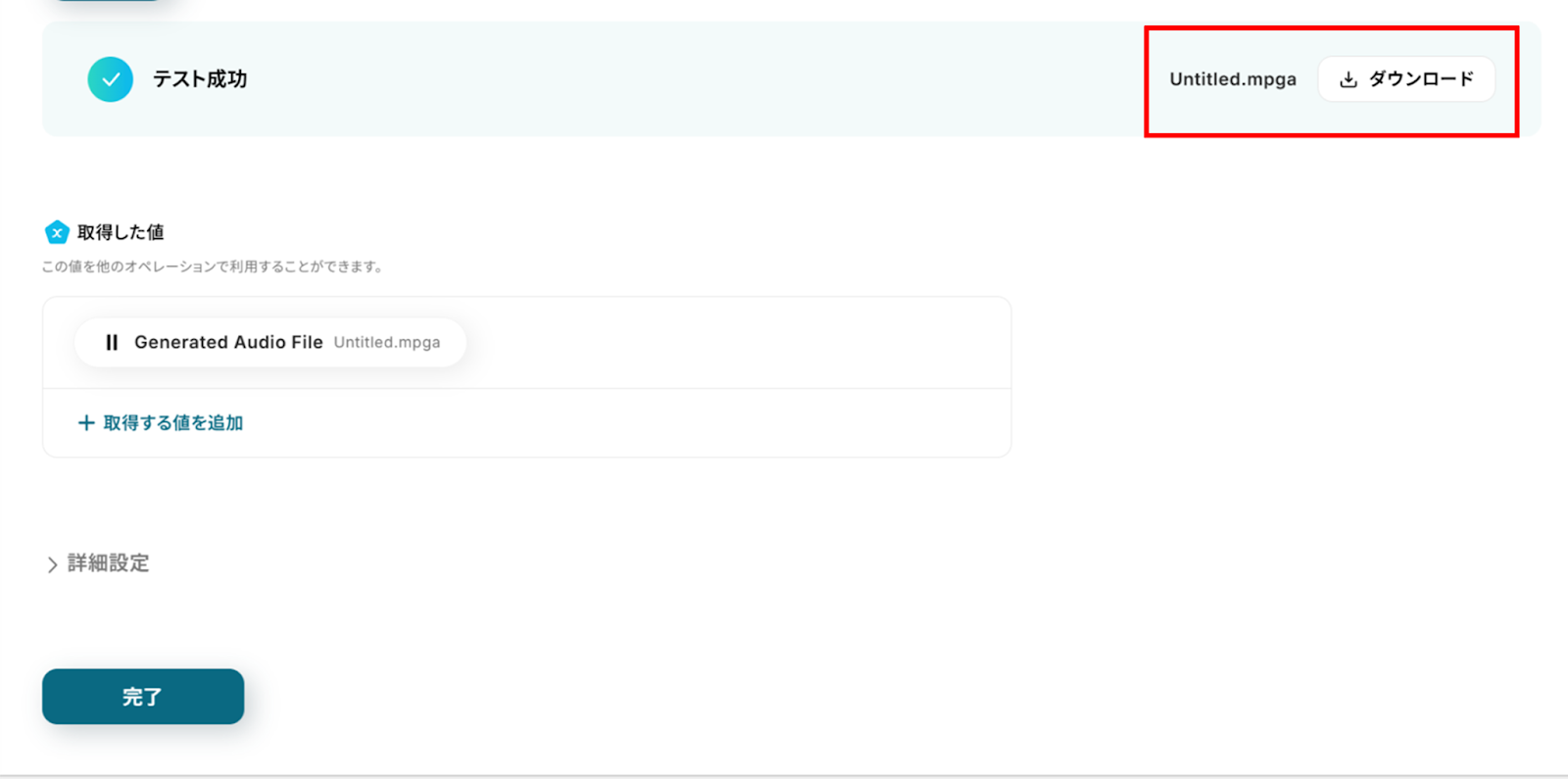 テストに成功すると、ElevenLabsで作成された音声データがダウンロードできます。