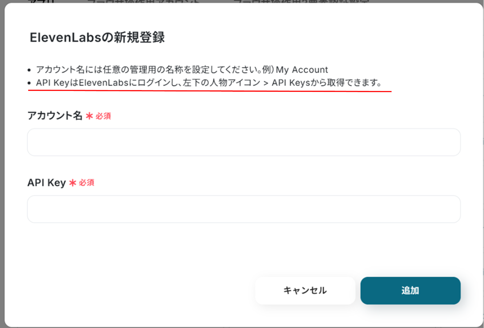 (2)「ElevenLabsの新規登録」画面から赤線を確認の上、アカウント名、API Keyを入力し「追加」をクリックします。