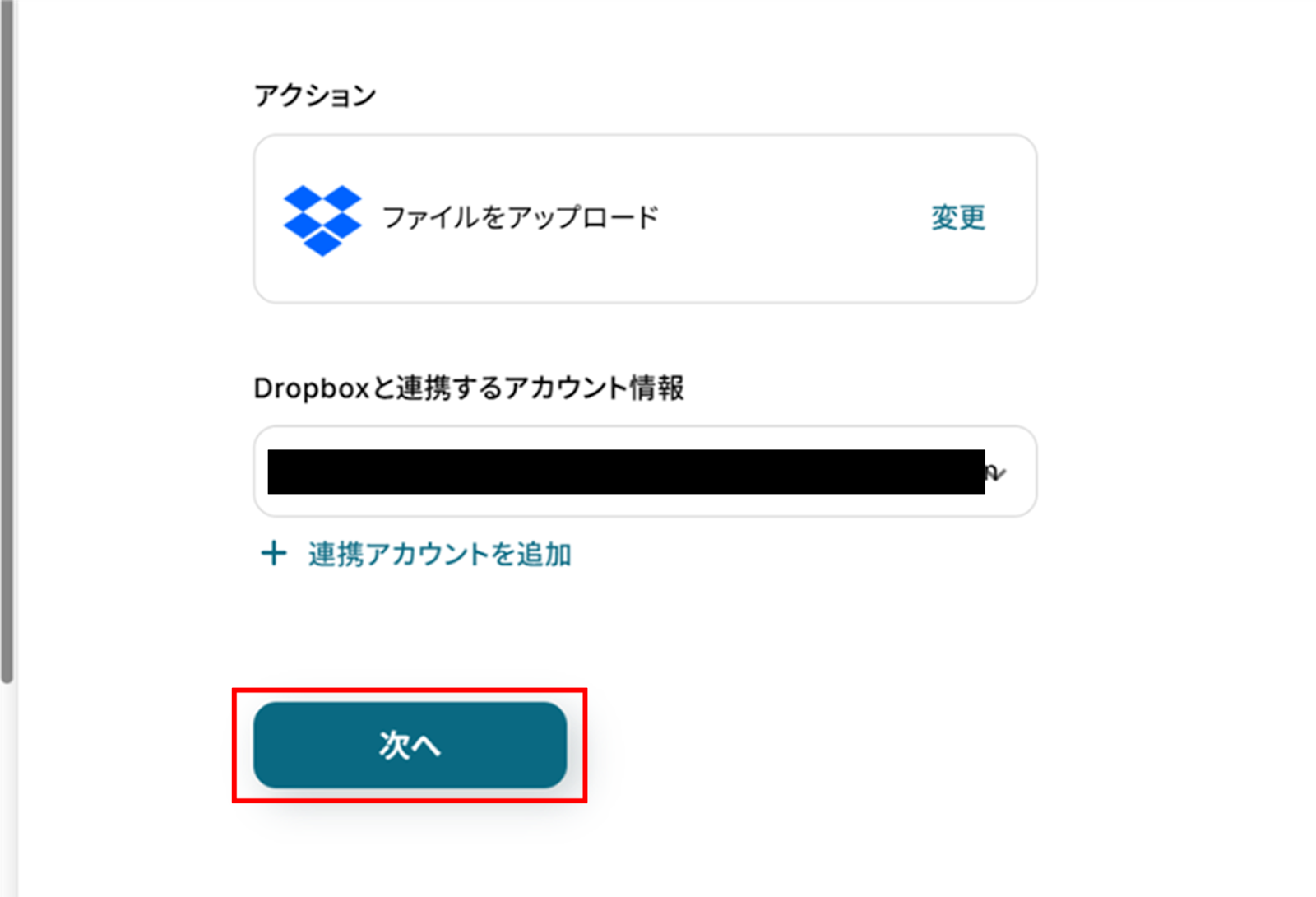 (2)「連携アカウントとアクションを選択」画面から、Dropboxと連携するアカウント情報に誤りがないかを確認し、アクションは「ファイルをアップロード」のままで「次へ」をクリックします。