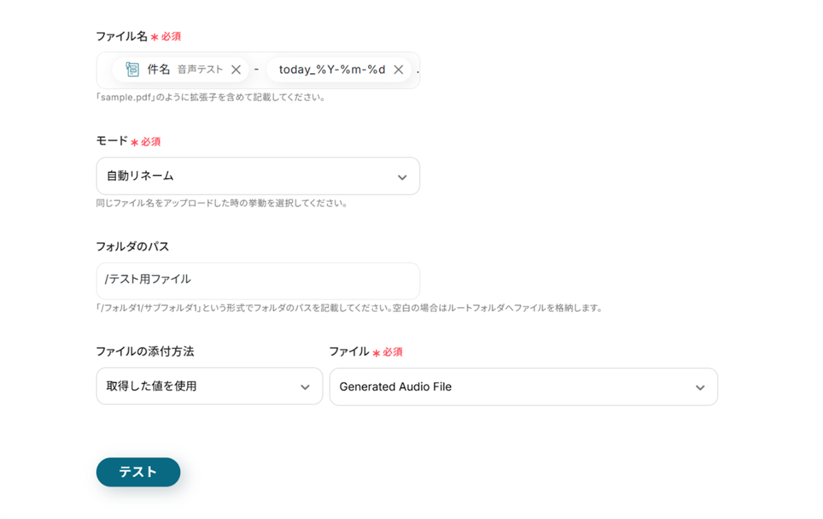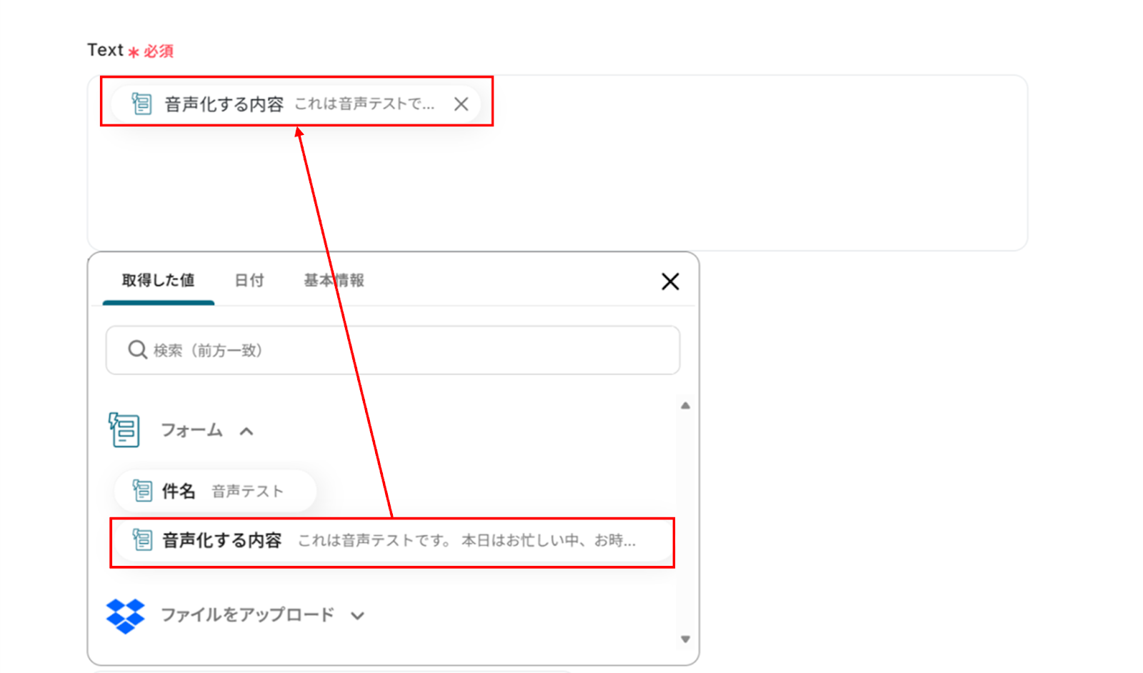 - 最後に、オペレーションでDropboxの「ファイルをアップロード」アクションを設定し、生成された音声ファイルを指定のフォルダにアップロードします。