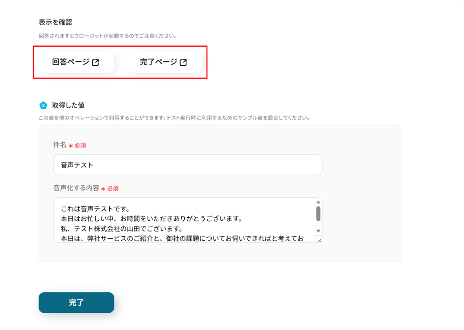 - フォームに入力されたテキストが自動で音声化され指定の場所に保存されるため、手動でのファイル生成や管理にかかる時間を削減できます。