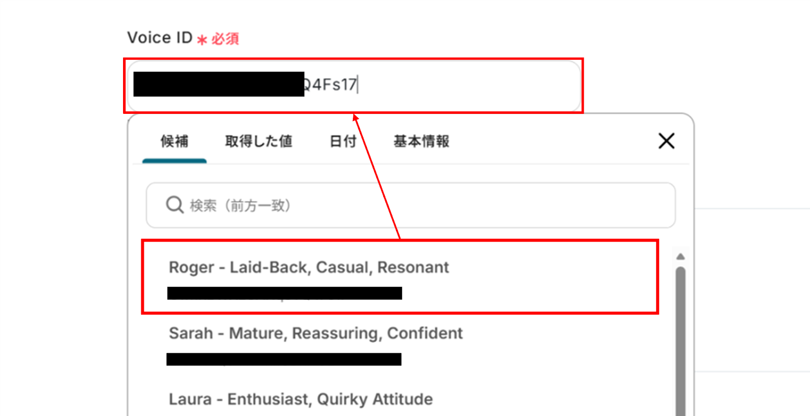 - ElevenLabsでの声の変換オペレーションでは、変換後の声の種類を示す「Voice ID」を任意で設定できます。