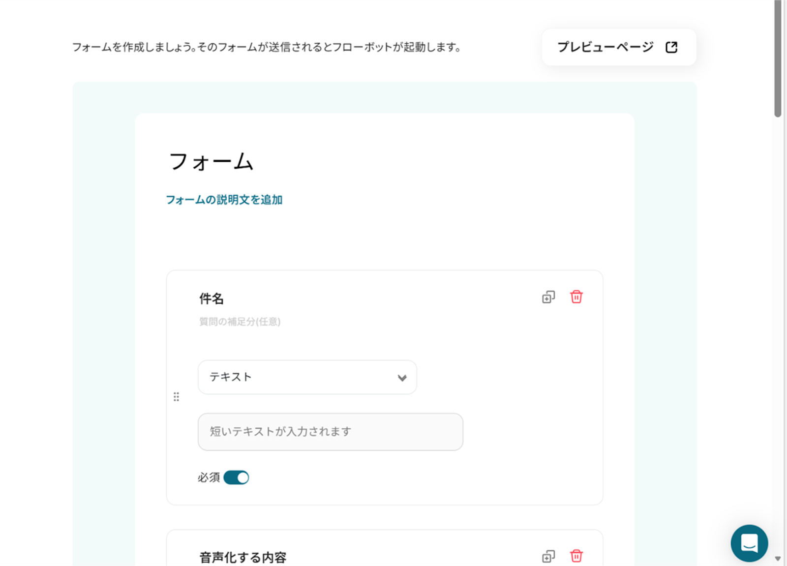 - フォームトリガーの設定では、音声に変換したいテキストの入力欄など、フォームの項目や回答種別を任意で設定することが可能です。