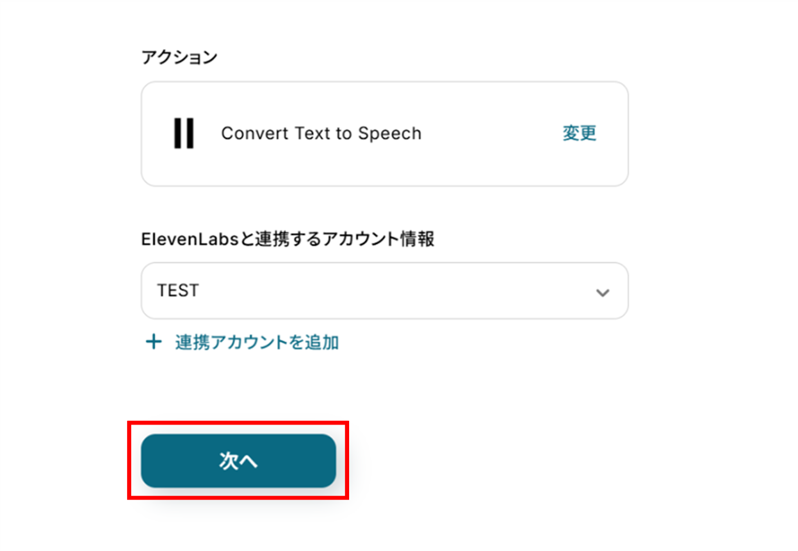 (2)「連携アカウントとアクションを選択」画面から、ElevenLabsと連携するアカウント情報に誤りがないかを確認し、アクションは「Convert Text to Speech」のままで「次へ」をクリックします。