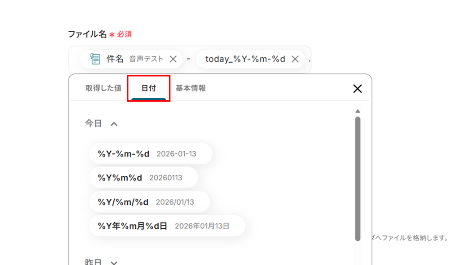 ファイル名は下の画像のように「件名+当日の日付+固定分」など自由に設定することができます!