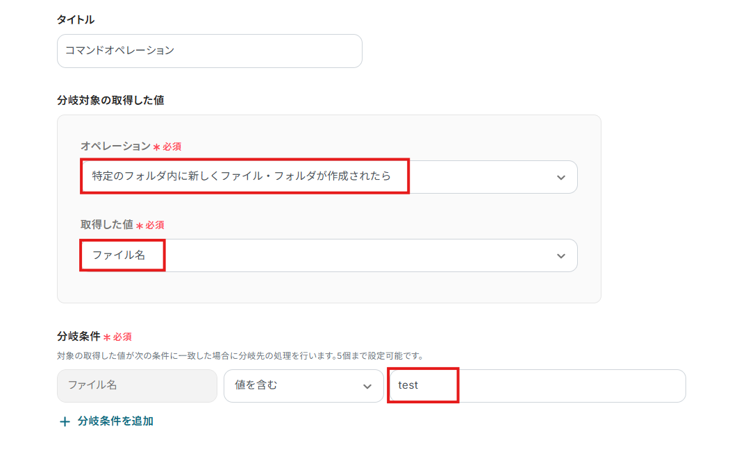 今回は、以下画像のように、取得した値を「ファイル名」とし、そのファイル名に「test」というワードが入っていることを条件としています。