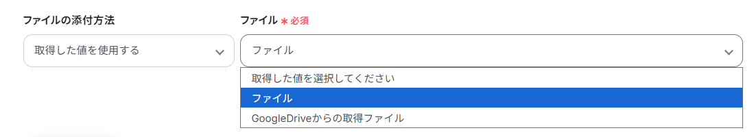 「ファイルの添付方法」「ファイル」は、プルダウンから選択します。