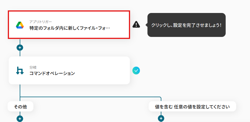 オペレーションに「特定のフォルダ内にファイル・フォルダが作成されたら」、取得した値に検知したい項目を設定します。