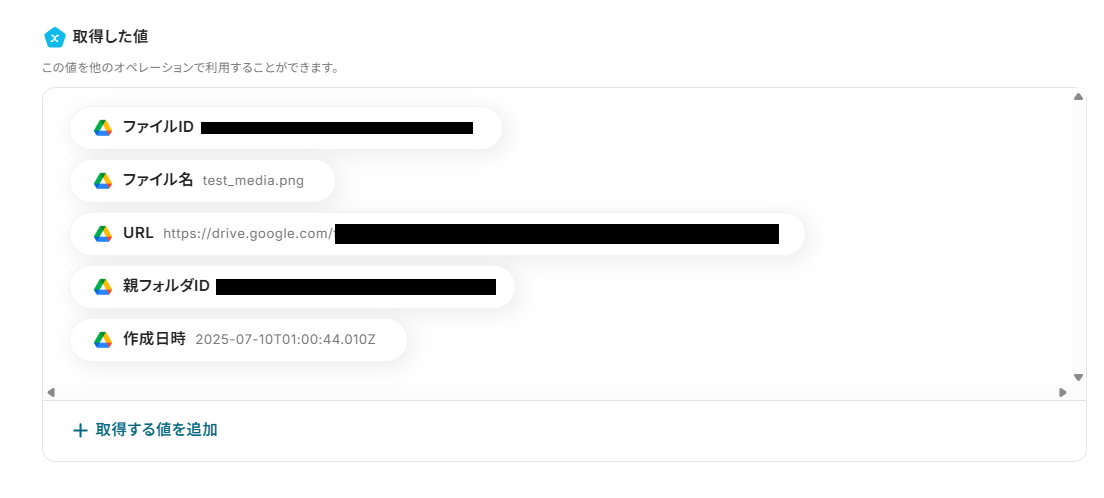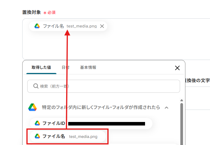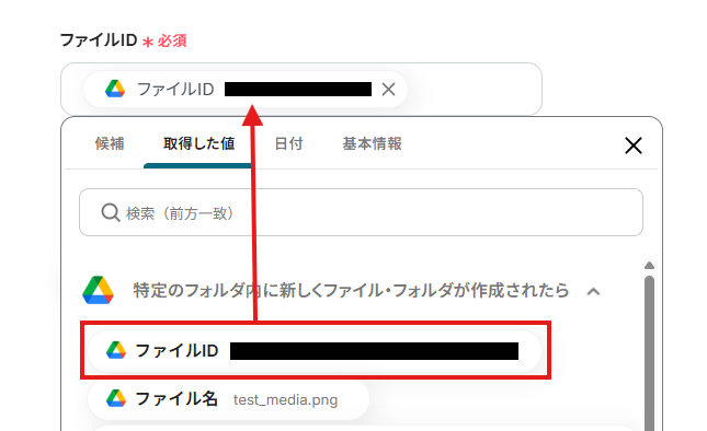 「ファイルID」は、入力欄をクリックして表示される取得した値から選択します。