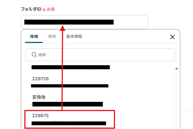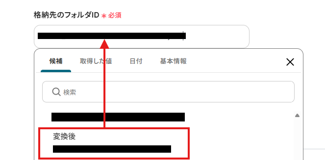 「格納先のフォルダID」は、入力欄をクリックして表示される候補から選択してください。