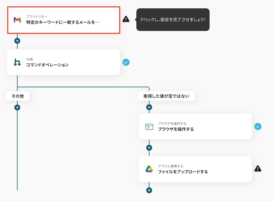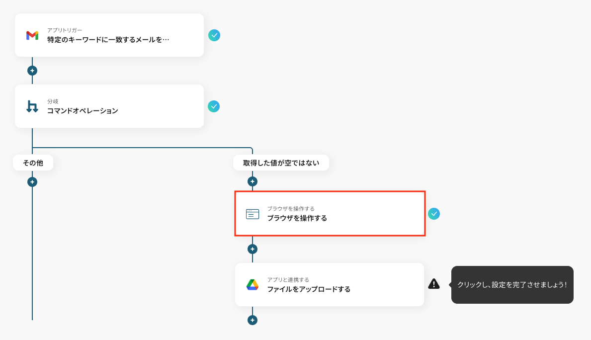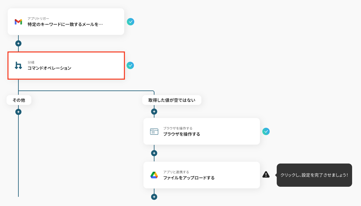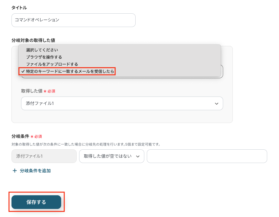分岐機能を設定し、添付ファイルの有無といった条件に応じて後続の処理を分岐させます。