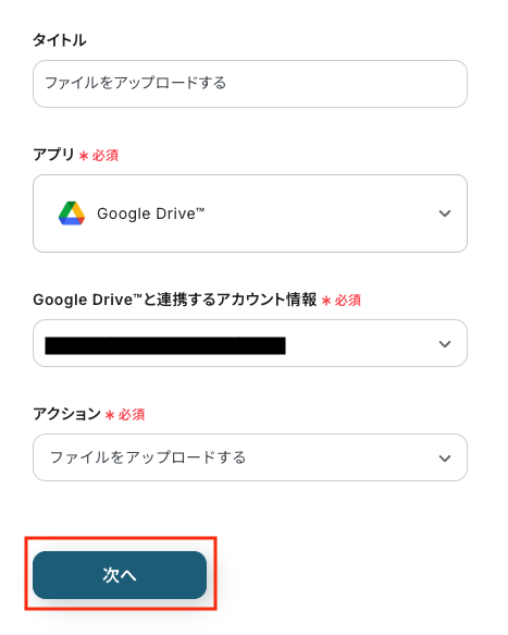 Google Driveのアクションを設定し、変換したPDFファイルを指定のフォルダに格納します。