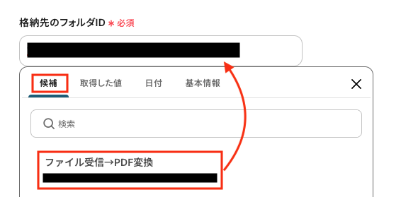 「格納先のフォルダID」を手動で入力、または候補から選択します。