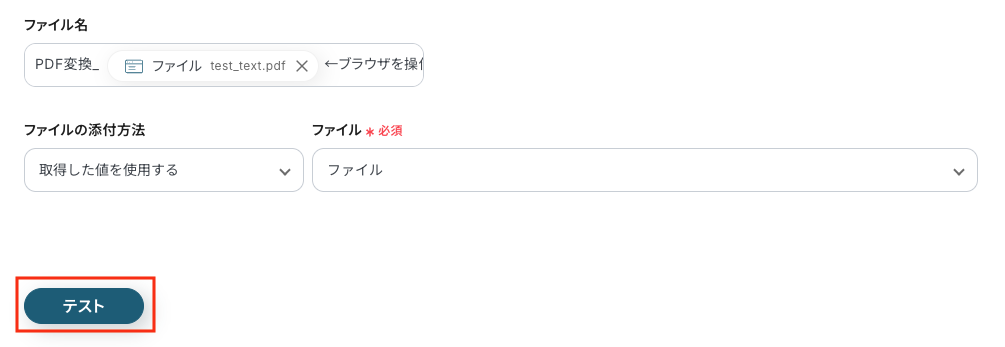 「ファイル名」を指定したい場合は任意の文言を入力し、「ファイルの添付方法」「ファイル」は、以下を参考に設定してください。