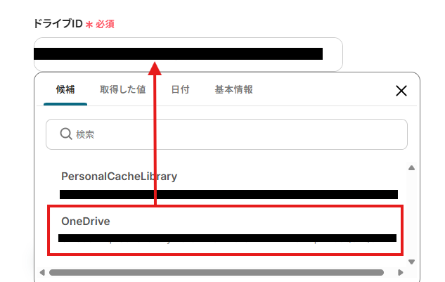 「ドライブID」は、入力欄をクリックして表示される候補から選択してください。