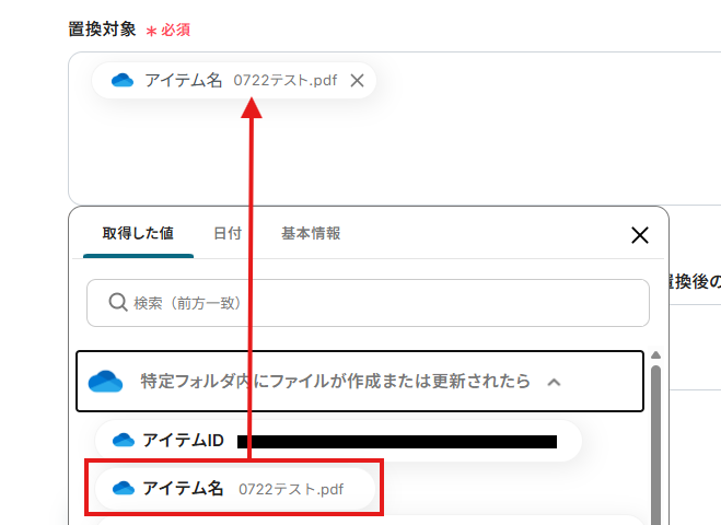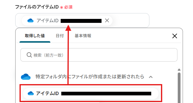 「ファイルのアイテムID」は、入力欄をクリックして表示される取得した値から選択してください。