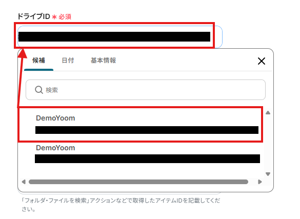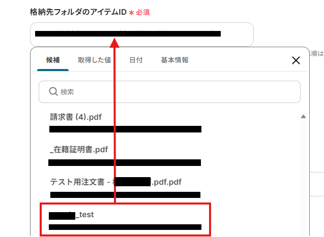 「格納先フォルダのアイテムID」は、入力欄をクリックして表示される候補から選択してください。