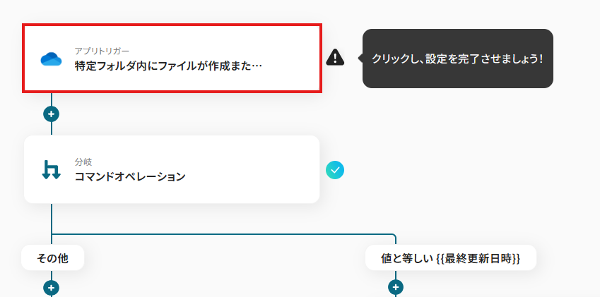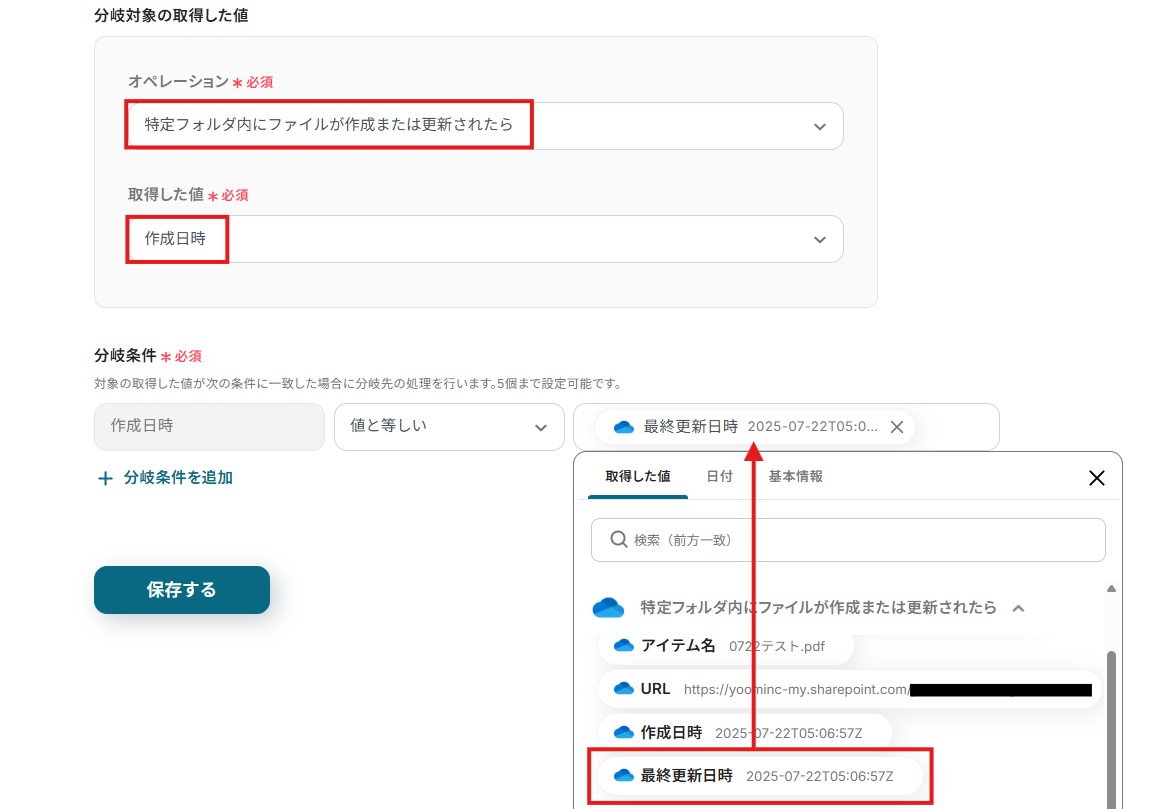 オペレーションに「特定フォルダ内にファイルが作成または更新されたら」、取得した値に検知したい項目を設定します。