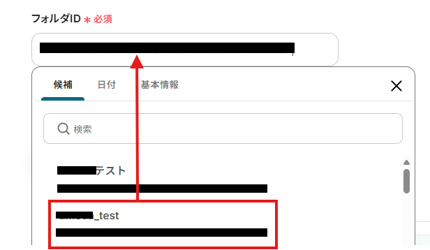 「フォルダID」は、入力欄をクリックして表示される候補から選択してください。