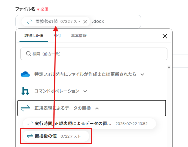 「ファイル名」は、入力欄をクリックして表示される取得した値から選択してください。