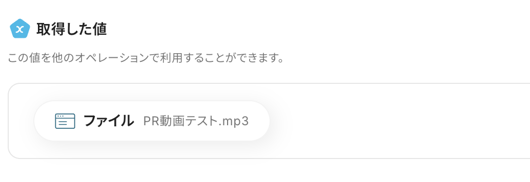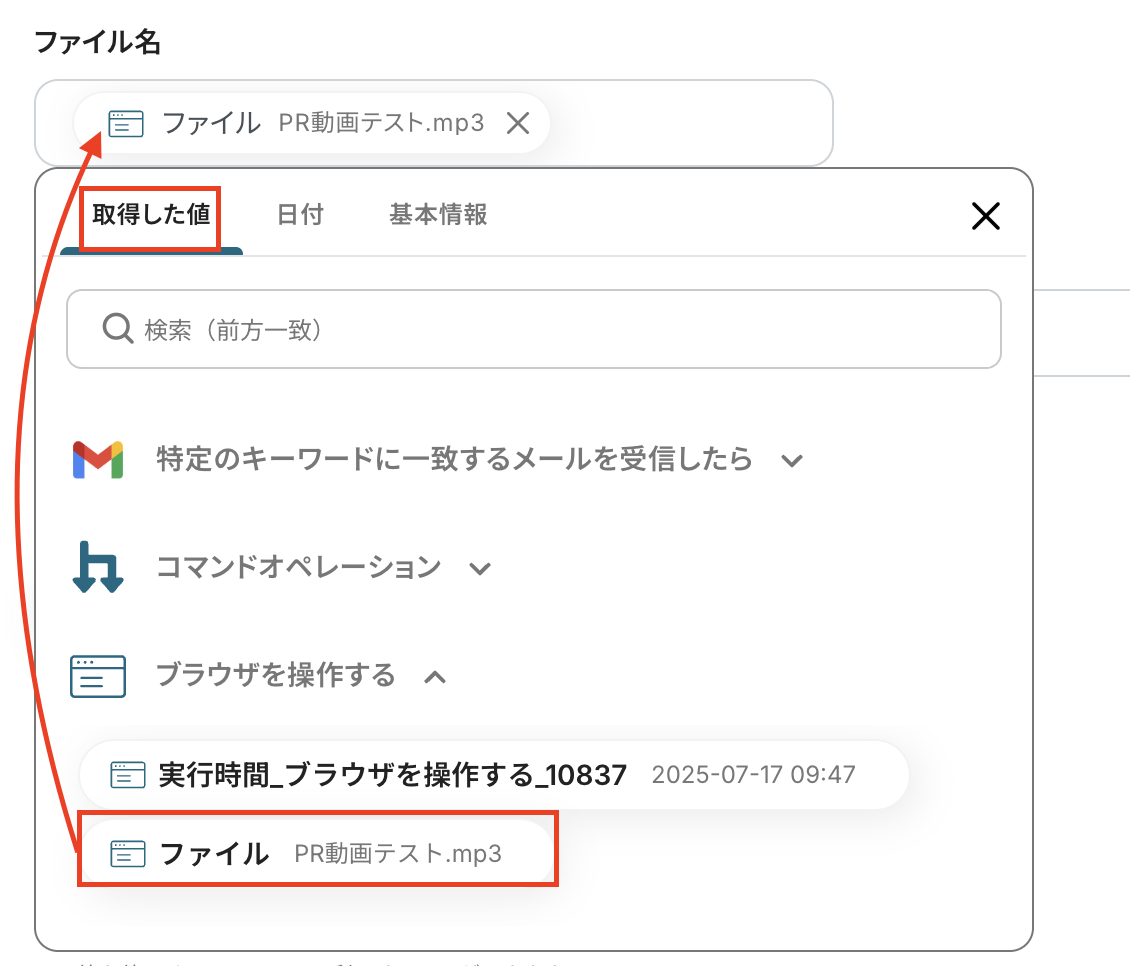 ファイル名は、ブラウザを操作するの取得した値から「ファイル」を選択しましょう。