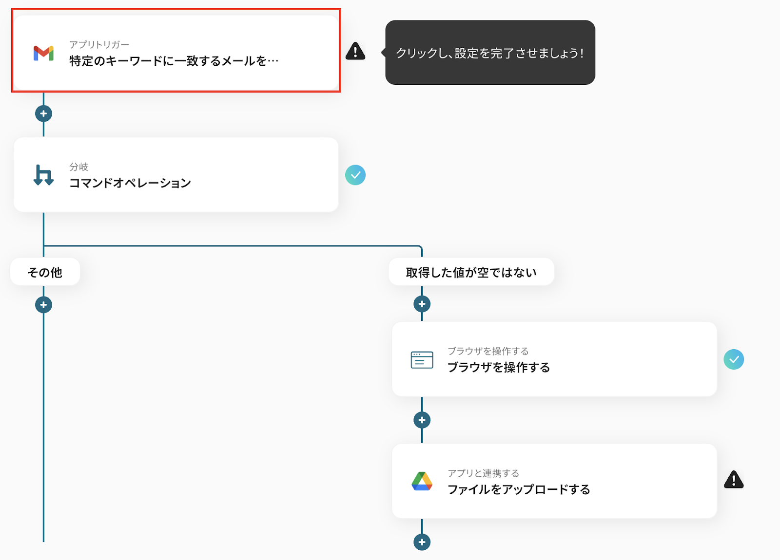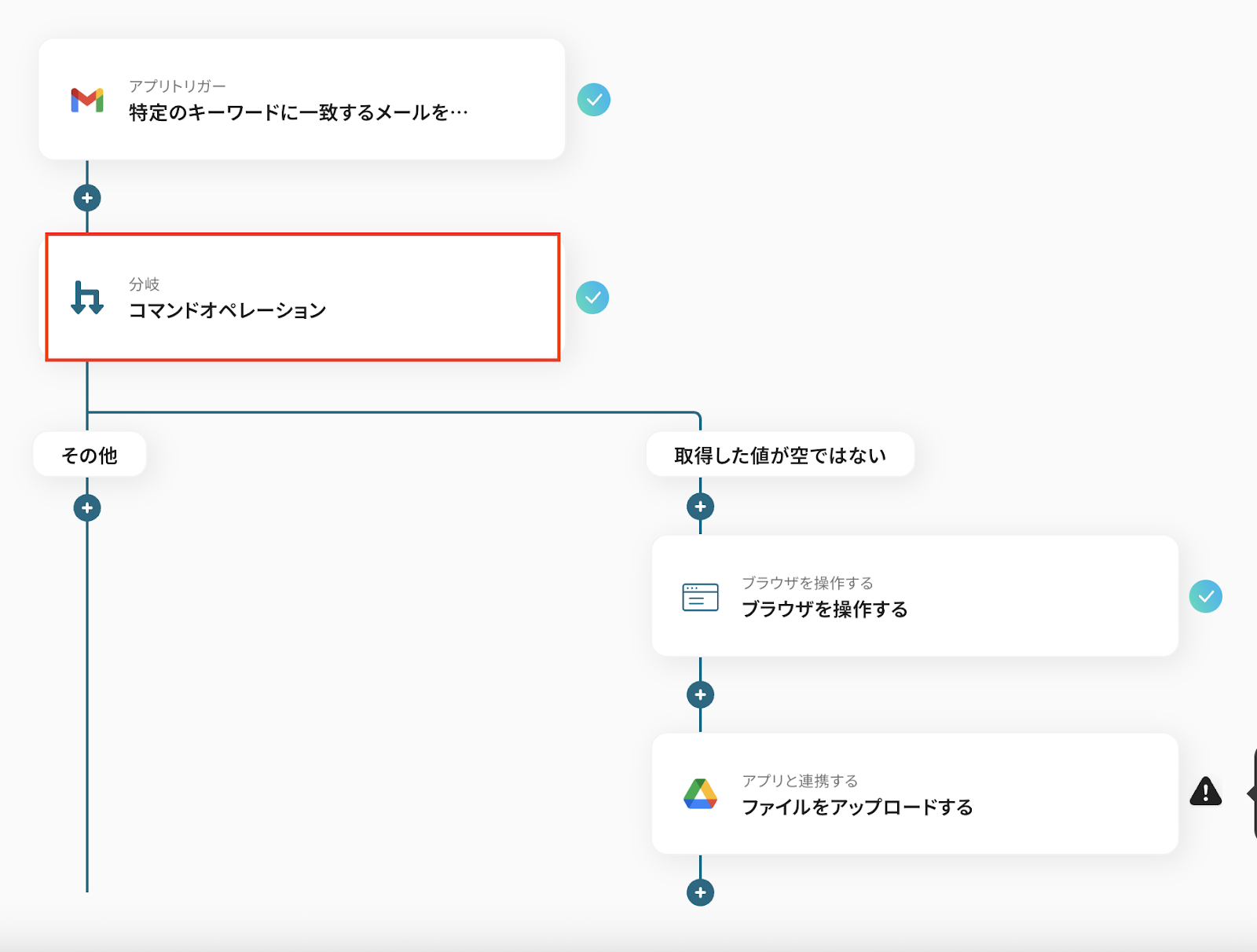この設定により、ファイルが添付されているメールかどうかを判断し、添付されていれば、フローが進みます。