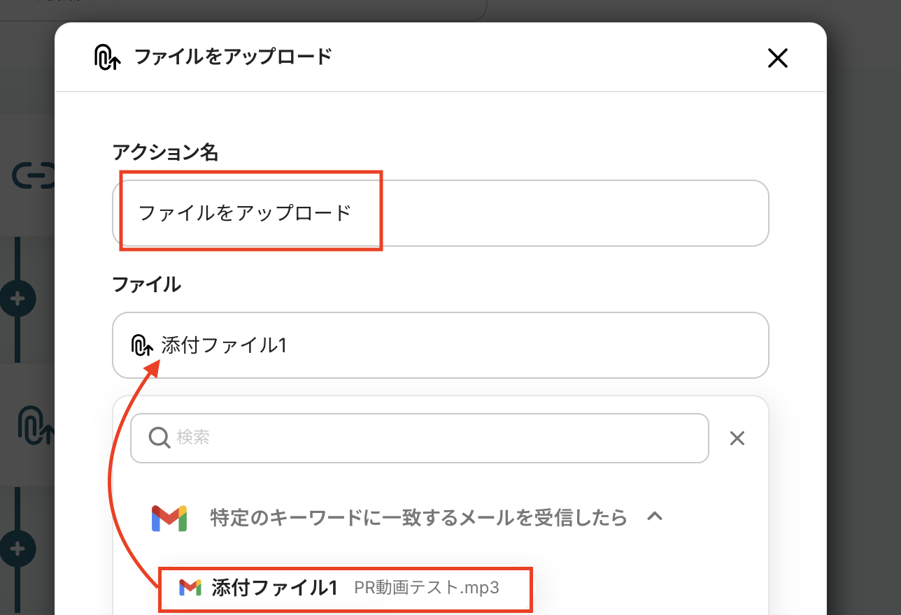 - オペレーションは「特定のキーワードに一致するメールを受信したら」、取得した値は「添付ファイル1」を選択します。