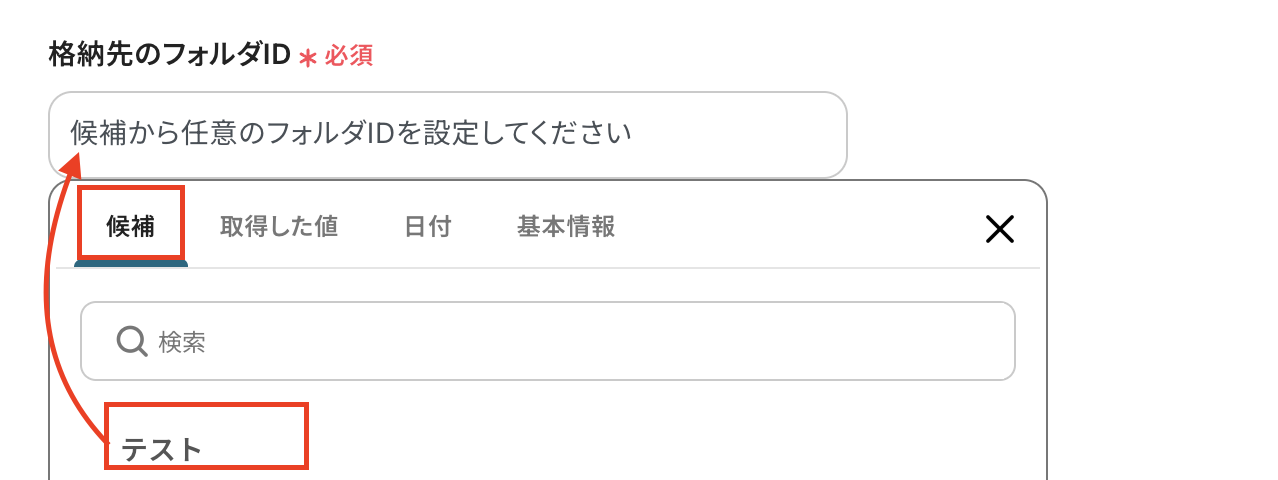 ファイルの添付方法は「取得した値を使用する」、ファイルは「添付ファイル1」を選択し、テストをクリックします。