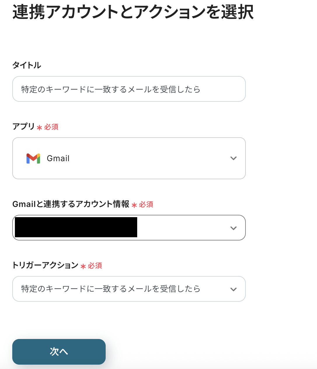 連携アカウントとアクションを選択の設定はできているので、以下を確認して次へをクリックします。