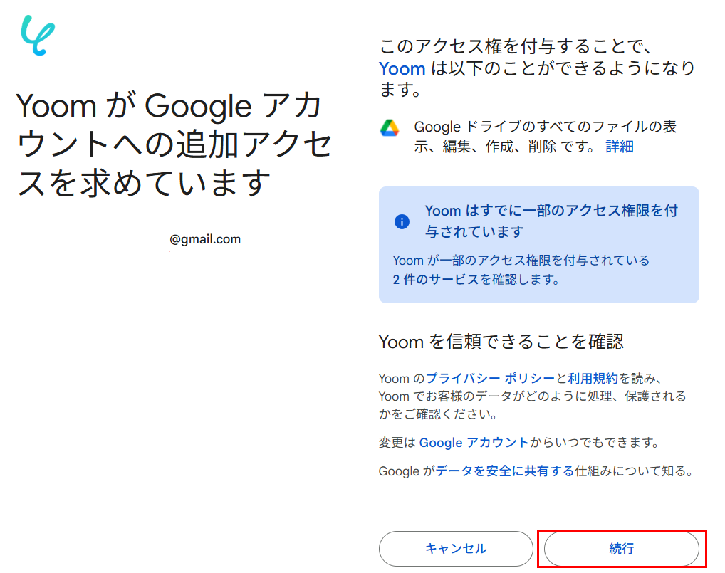連携を行いたいアカウントを選択します。 以下の画面が表示されたら、内容を確認し問題なければ「続行」をクリックしてください。