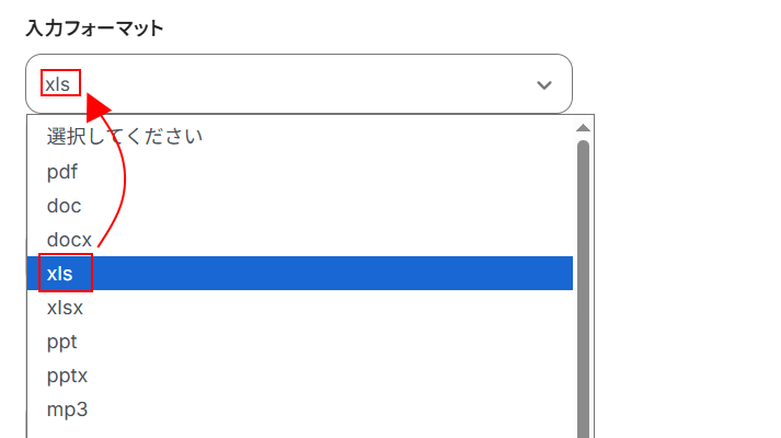 入力フォーマットを設定します。入力欄をクリックし、プルダウンメニューから選択しましょう。 今回は、「xls」を選択しました。