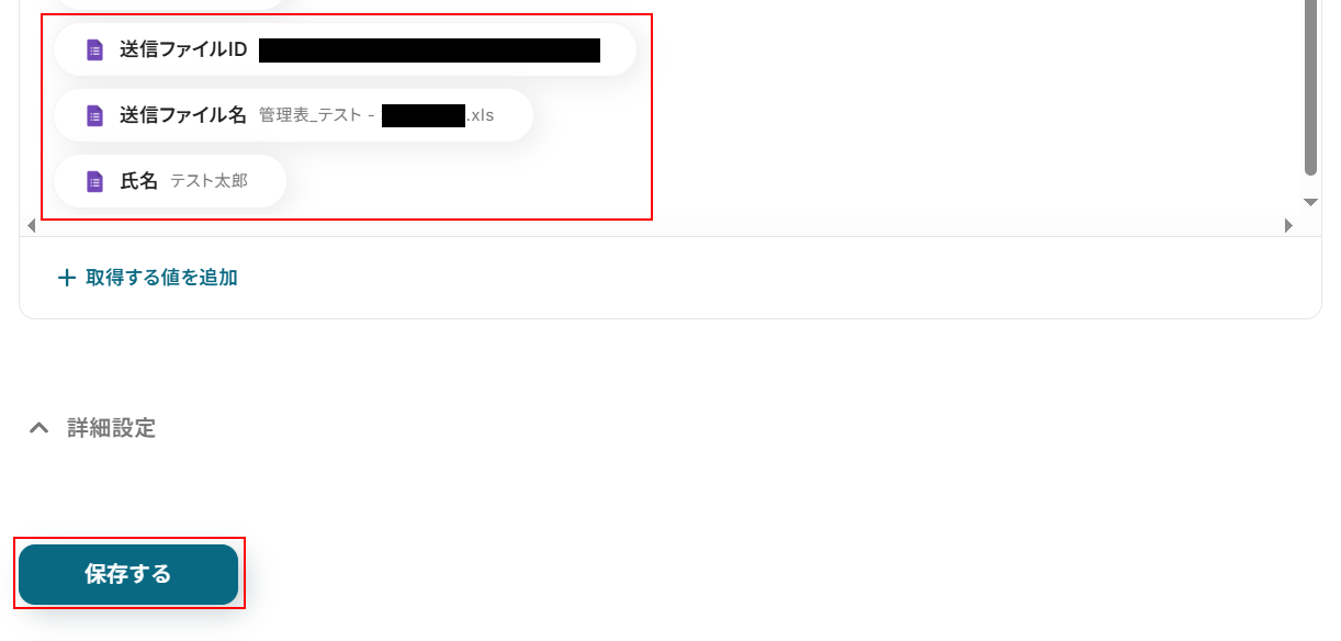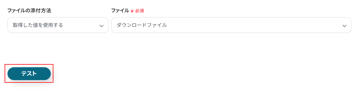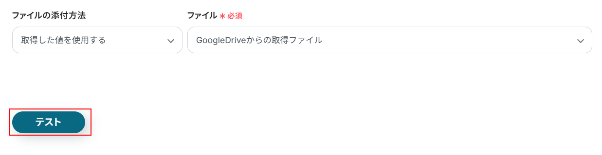 ファイルの添付方法、ファイルはデフォルトで下記のように設定されています。 念のため、「取得した値を使用する」「Google Driveからの取得ファイル」に設定されていることを確認したら、「テスト」をクリックしてください。