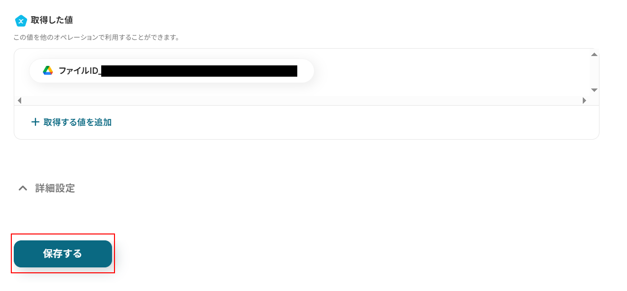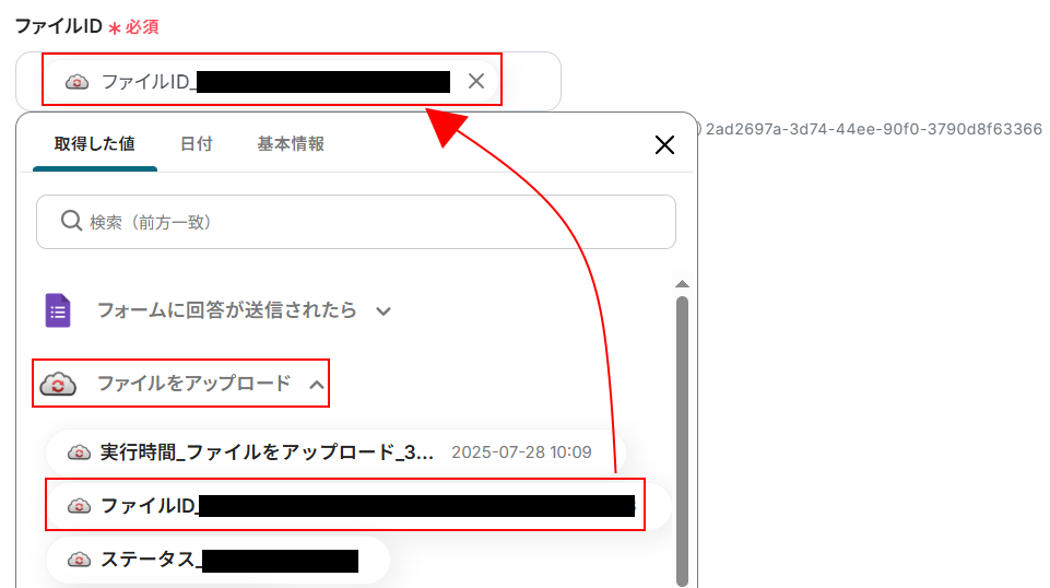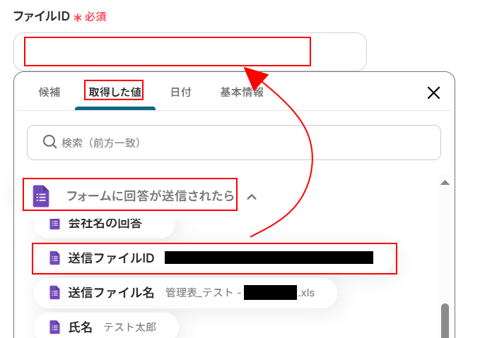 ファイルIDには、先ほどの取得した値を設定します。入力欄をクリックすると、候補が表示されます。 「取得した値」タブの、「フォームに回答が送信されたら」から、ファイルIDを選択しましょう。