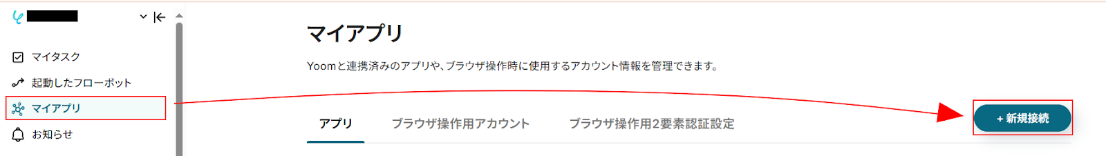 まずは、Yoomにログインします。 左側に、「マイアプリ」が表示されていますので、クリックしましょう。 マイアプリ画面に遷移すると、右側に「+新規接続」ボタンが表示されますので、クリックします。