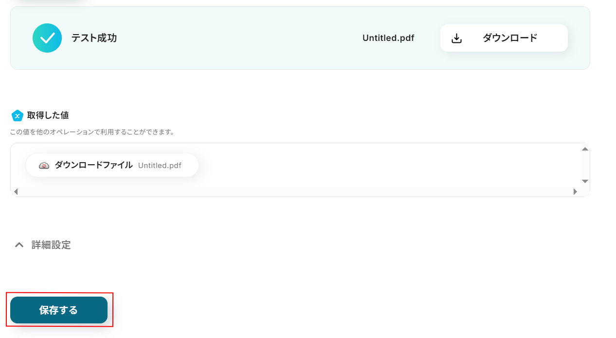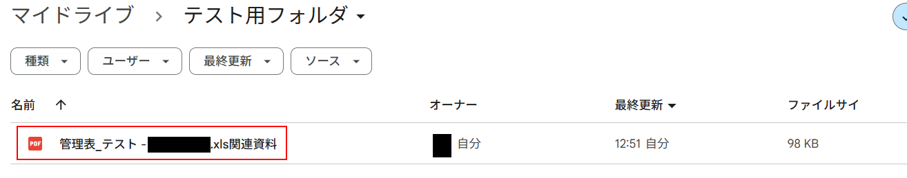 ※テストをクリックすると、実際にpdfに変換されたファイルが、先ほど指定したGoogle Driveのフォルダ内に保存されます。