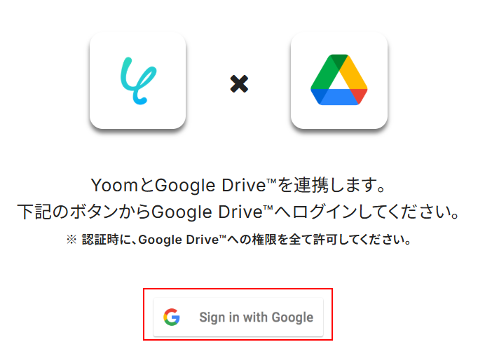 「+新規接続」をクリックし、入力欄に「Google Drive」と入力します。 アプリを選択すると、下記の画面が表示されますので、「Sign in with Google」をクリックします。