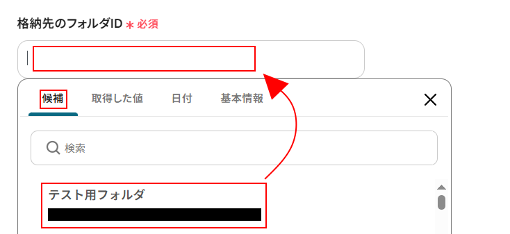 次に、格納先のフォルダIDの入力欄をクリックすると、候補が表示されます。ファイルを格納したいフォルダを選択しましょう。