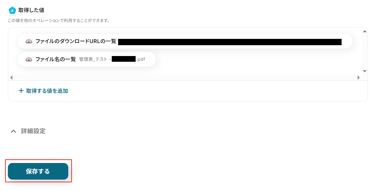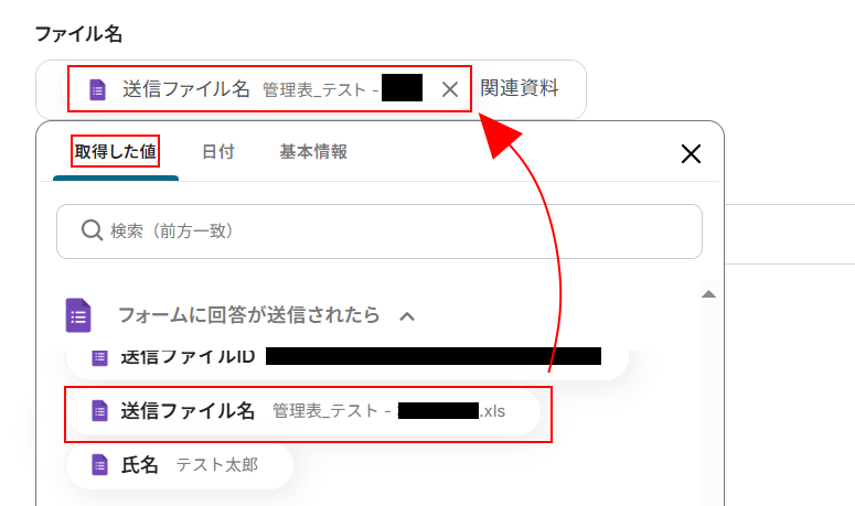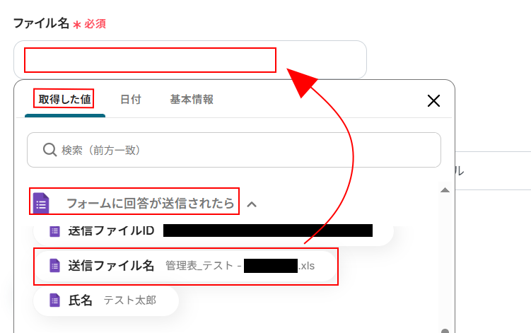 ファイル名は先ほどと同様に、取得した値から設定します。 入力欄をクリックし、「取得した値」タブ「フォームに回答が送信されたら」から選択しましょう。