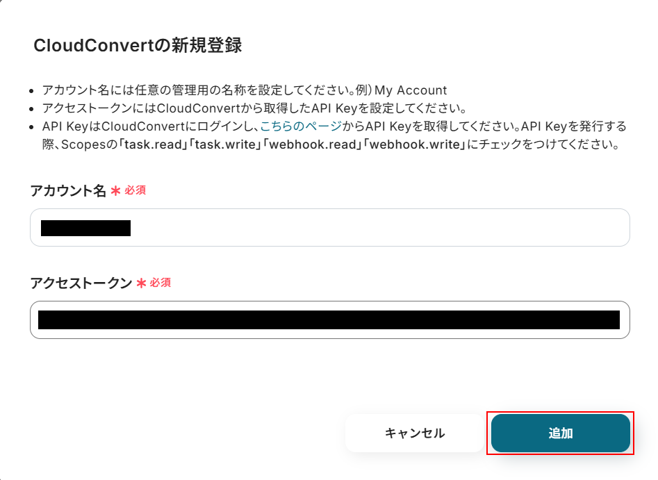 先ほどと同様に、「+新規接続」ボタンをクリックし、入力欄に「CloudConvert」と入力します。 表示されたアプリを選択すると、下記の画面が表示されます。 表示内容に従って、アカウント名、アクセストークンを入力し、「追加」をクリックしてください。