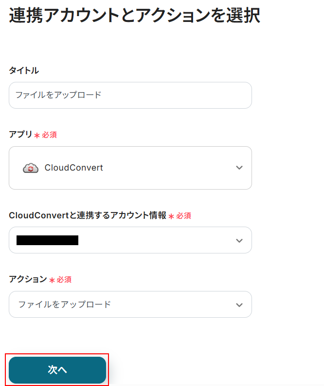 「CloudConvertと連携するアカウント情報」が任意のものに設定されていることを確認したら、「次へ」をクリックします。